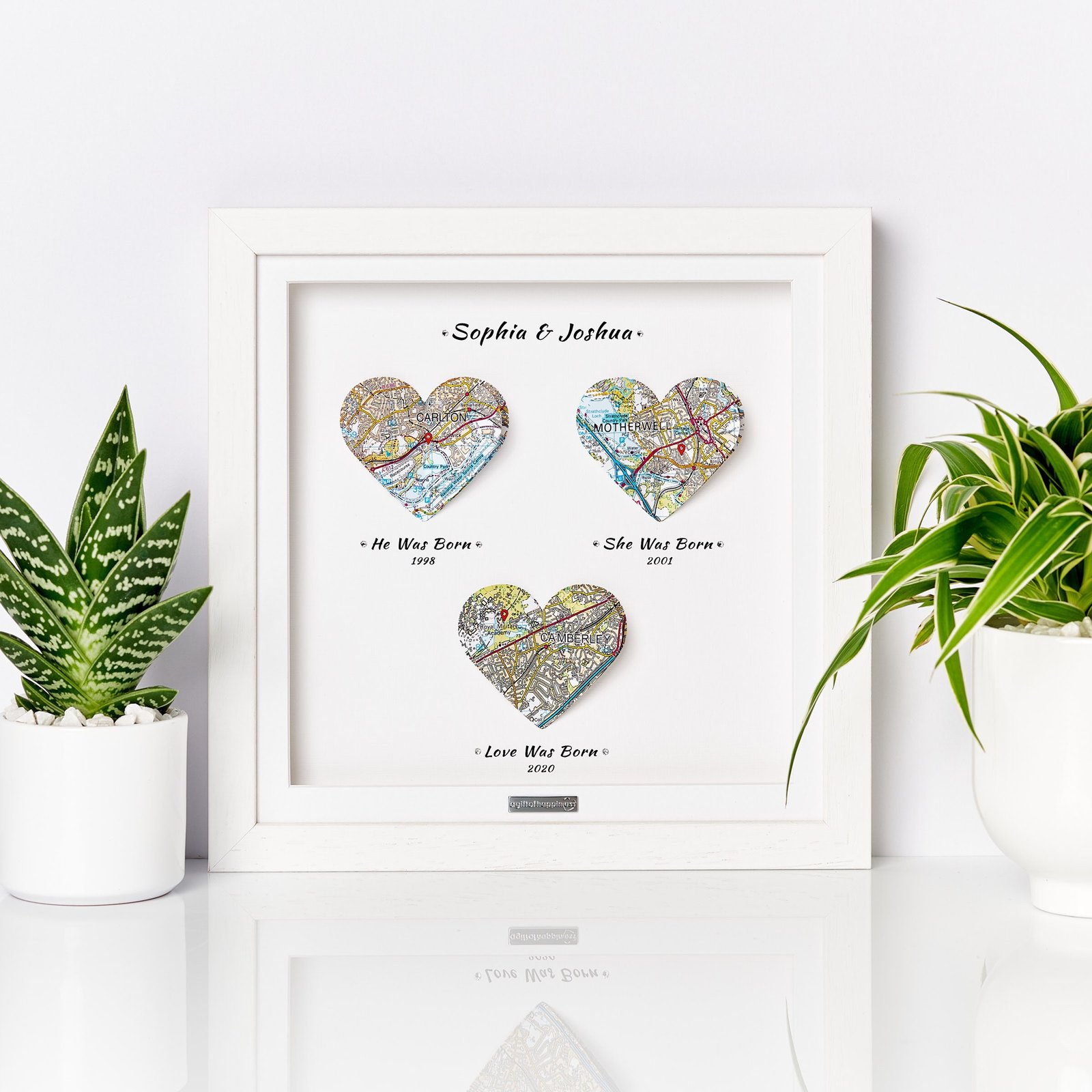 Celebrate your journey of love with our Heart Maps Anniversary Gift, a thoughtful and sentimental way to honor the special moments in your relationship. This unique gift features three heart-shaped maps, each highlighting a significant location in your love story – from where you first met, to your memorable first date, and the magical spot of your first kiss. Whether you’re looking for a meaningful anniversary gift for him or her, this personalized keepsake will remind you both of the milestones that have shaped your bond and create a lasting memory of your love story.